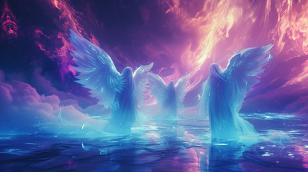 Three ethereal figures with majestic wings emerge from vibrant clouds, illuminated by a warm golden glow that fills the tranquil sky, creating a serene atmosphere.