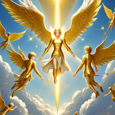 Ethereal beings with golden wings stand together, enveloped in a warm, glowing light against a mystical backdrop, creating a sense of serenity and divine presence.