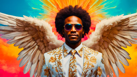 A Smiling Man African American With Colorful Wings Poses Against a Vibrant Sunset Sky.