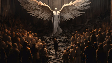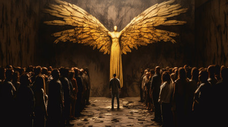 Guardian angel resists the forces of evil. Heavenly light surrounds him.