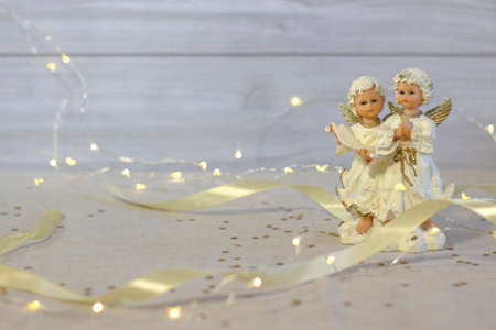 Little ceramic angels pray and sing songs, on a blurred background, satin ribbon and lights