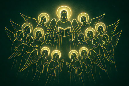 Golden angelic choir illustration with glowing halo singers on dark background. concept of spiritual harmony, celestial beauty, divine inspiration.