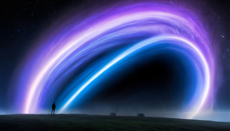 In the image, a solitary figure stands on a grassy landscape under a night sky illuminated by a mesmerizing, swirling vortex of light. The vortex exhibits vibrant hues of blue, purple, and white, creating a striking contrast against the dark sky and the silhouette of the observer. The scene evokes a sense of wonder and contemplation, as if the individual is witnessing a cosmic phenomenon or the edge of a black hole. The stars twinkle subtly in the background, enhancing the ethereal and otherworldly atmosphere of the scene.