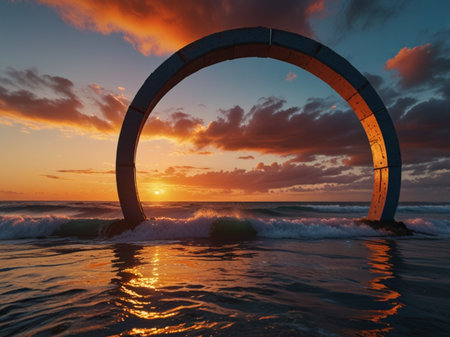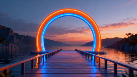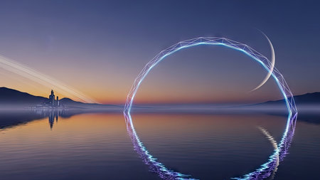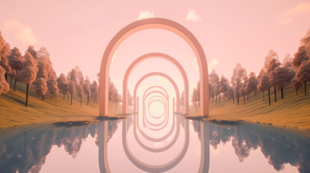 An ethereal scene displays a glowing arch over a calm body of water, reflecting the form in a mirrored image. The composition features a gradient sky with warm and cool colors. The artwork suggests a serene, futuristic setting suitable for conceptual projects or artistic illustrations.