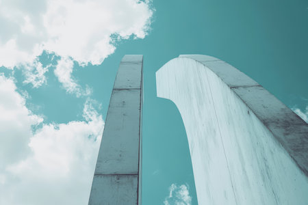 The image features two large concrete pillars that extend vertically into a blue sky with white clouds. The pillars are abstract, minimalist structures, creating a sense of perspective and depth.