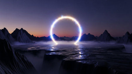 A luminous, circular portal of shimmering light hovers above a rocky, mist-shrouded landscape. Jagged mountains rise in the background under a twilight sky transitioning from deep purple to soft orange. The portal's glow reflects on the wet, dark rock formations and the ethereal mist. Tiny blue and gold sparks emanate from the ring, creating a magical and otherworldly atmosphere. The scene evokes a sense of mystery, wonder, and the unknown, suggesting a gateway to another realm or dimension.