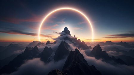 A landscape featuring dramatic, silhouetted mountain peaks piercing through a sea of soft clouds. A radiant, glowing golden ring encircles the highest peak, suggesting a celestial event like an eclipse or a divine halo. The sky is painted with the warm hues of sunset or sunrise, with streaks of orange, pink, and blue clouds. The overall mood is one of awe, majesty, and ethereal beauty.