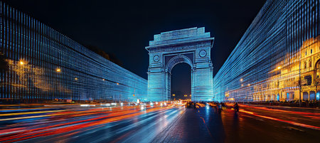 An AI generated illustration of This image features a vibrant street scene with a large illuminated arch positioned in the foreground