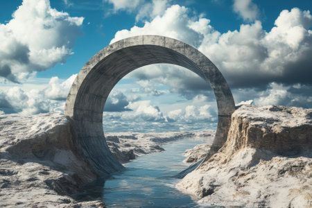 3d render, surreal desert seascape with red arch and white clouds in the blue sky on sunny day. Modern minimal abstract background with simple geometric shape and water