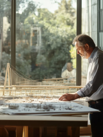 A civil engineer examines a detailed model of a bridge in a well lit office area showing his expertise and dedication to design.