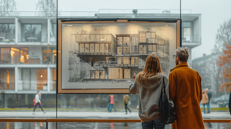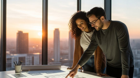 A cinematic wide shot capturing a couple making important future plans in a luxurious, modern real e