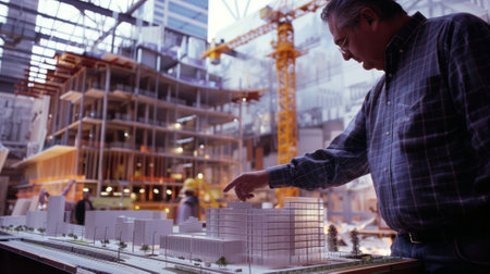 A wide angle view of an architect pointing to the model of an upcoming building with the cranes and scaffolding of the construction site towering behind