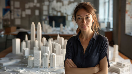 Confident architect holding blueprints while standing between modern skyscrapers, showcasing leadership in urban construction and design