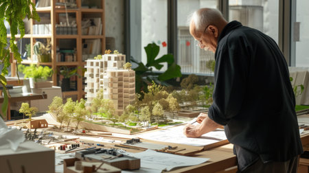 Architect is designing a sustainable building project, using a range of drawing tools in his modern office