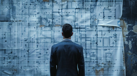 Construction professional reviewing architectural plans at a building site during daylight