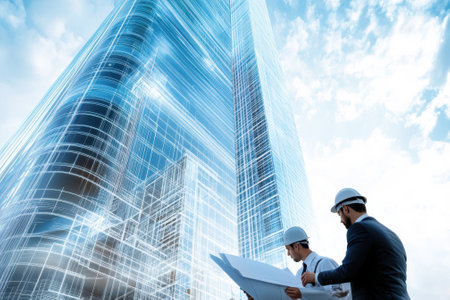Two engineers examine detailed blueprints for a modern skyscraper under a bright sky in a city.