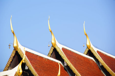 Thai temple roof with blue sky background, Bangkok, Thailand.