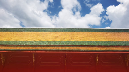 Stunning perspective of a traditional Thai temple, highlighting intricate architecture and colorful roof under a beautiful blue sky with fluffy clouds. Perfect for cultural themes.