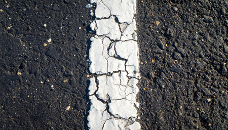 A close-up, top-down view captures the intricate network of cracks on a weathered white road line.