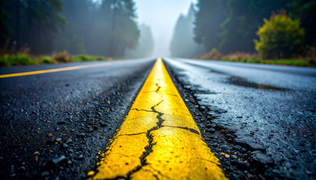 A low-angle view follows a cracked yellow line down a wet asphalt road, disappearing into a mysterious, foggy forest.