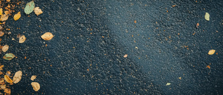 Bright yellow and brown leaves litter a dark asphalt surface capturing the essence of autumn. The leaves create a beautiful contrast with the road.