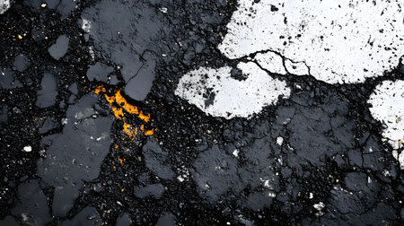 Detailed macro shot of a cracked asphalt road, highlighting rough textures and deep fissures with subtle light reflections on the uneven surface.