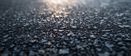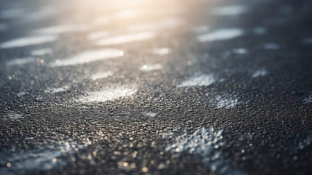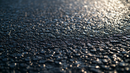 Macro shot of an asphalt road surface reflecting sunlight, creating a textured and glistening effect with a blurred background for depth and perspective.