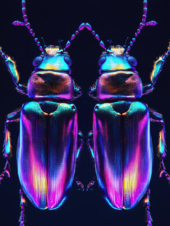 Vibrant iridescent beetles duo macro photography nature insect art up blue pink gold dark green