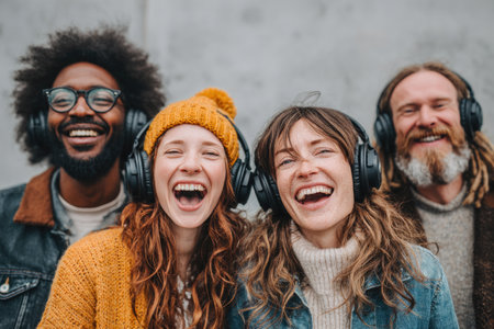 A diverse group of young adults is captured outdoors on a city street. They are seen laughing and interacting in a candid moment. The composition uses natural light. This image could be used for lifestyle content, promoting social connections, or illustrating concepts of friendship.
