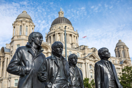 Liverpool, UK - July 30th 2018: Statues of The Beatles - Paul McCartney, George Harrison, Ringo Starr and John Lennon - with the Port of Liverpool building in the background, in the historic city of Liverpool, UK.