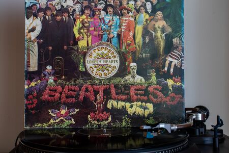 Naples, Italy 20 August 2019. Turntable with the Abbey Road vinyl of the Beatles in the background.