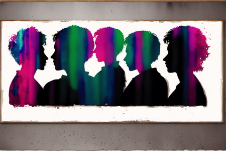 Row of diverse men and women facing sideways with multicolored gradient symbolizing inclusion and equity. Representation of multiracial group.
