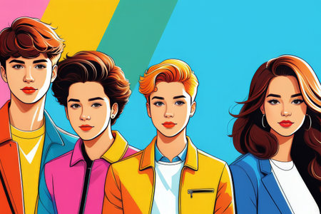 Five young adults stand together with arms crossed, showing diverse styles against a vibrant gradient backdrop, indicative of a modern social gathering.