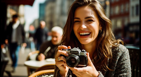 A smiling woman with long brown hair holds a black camera, standing outdoors in a bustling city environment.