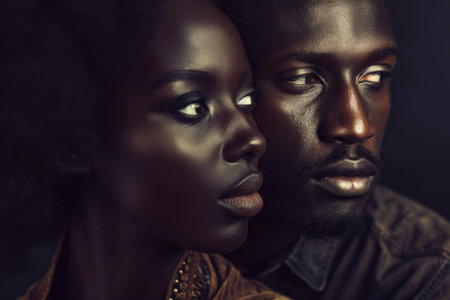 An elegant African American couple poses for a close-up portrait against a dark background in a studio setting in Italy, showing sophistication and connection. High quality photo