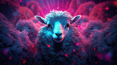 A neon-lit sheep stands on a black background, illuminated with pink and blue lights