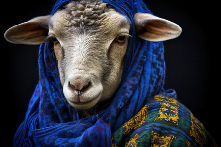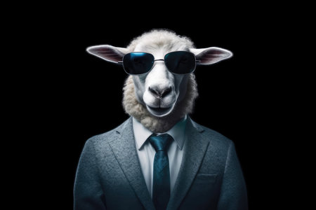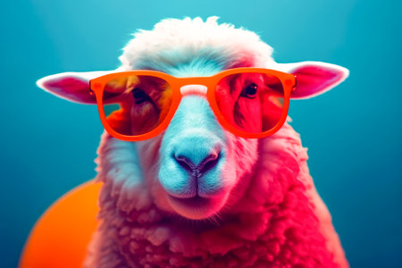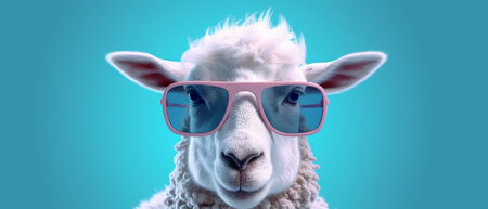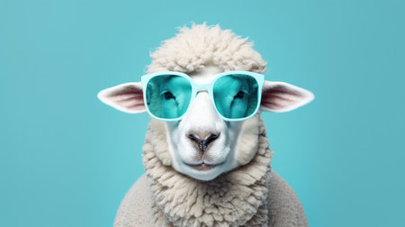 a sheep donning sunglasses poses against a vibrant blue backdrop in this stock photo (4428784). the image is characterized by lo-fi aesthetics and features elements of pop-culture-infused social media portraiture. the teal and white color scheme adds to the overall visual appeal. the photo is reminiscent of the works of artists such as david normal, jimmy lawlor, and tami bone. ai generated