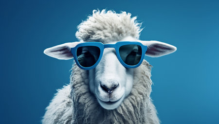AI Generated. close up of a sheep wearing glasses with copy space on blue background