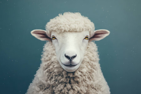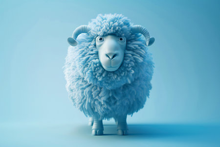 Cute fluffy sheep with a friendly expression, standing against a calming blue background, highlighting the warmth and tranquility of rural life and nature