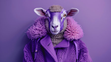 A sheep is dressed in a warm jacket, sporting sunglasses and a thick scarf. This unusual outfit contrasts its fluffy wool, creating a playful and whimsical appearance.