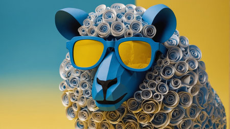 AI Generated. Funky sheep in blue sunglasses on yellow background