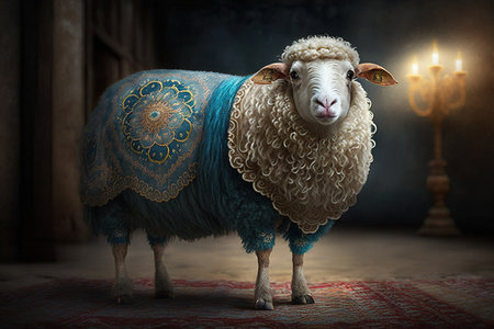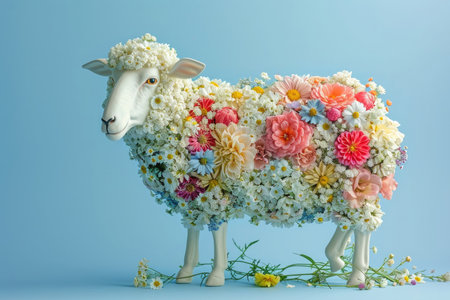 An AI illustration of a sheep perched on a blue background, adorned with colorful flowers.