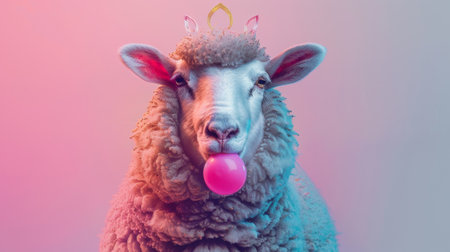 Portrait of a sheep blowing a pink bubble, adorned with a delicate crown, pastel gradient background. Creative animal photography concept.