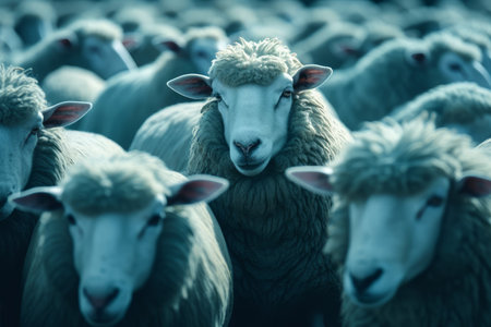 A lone black sheep surrounded by a sea of white sheep, creating a striking contrast that symbolizes nonconformity and being different.