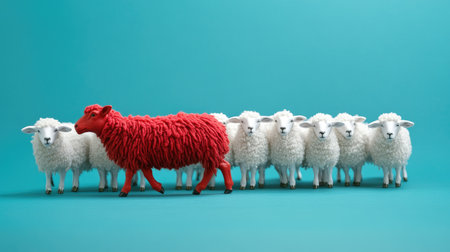 A red sheep leading a group of white sheep, symbolizing leadership and diversity in action.