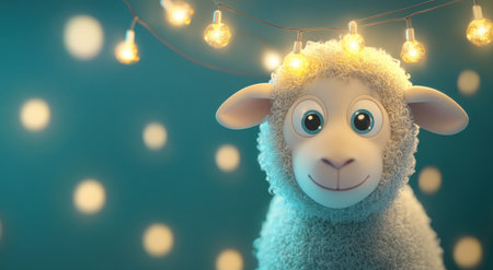 3D cartoon, a sheep character with hanging string lights on top of its head, in the style of Pixar, adorable eyes, lovely, matte finish, soft edges, teal and white background, wide-shot camera. --ar 78:43 --v 6.1 Job ID: f9260122-165f-4763-85d3-936e55feb9b7