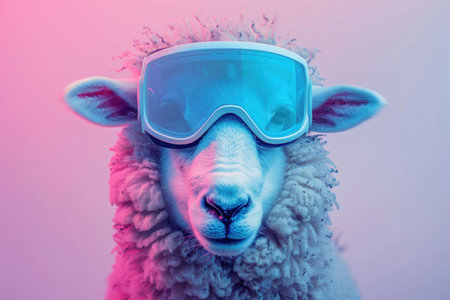 A sheep wearing futuristic ski goggles against a soft pink and blue gradient background The sheep s wool stands out, creating a playful and surreal atmosphere
