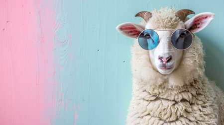 Playful sheep sporting sunglasses against pastel backdrop, allowing room for text placement.