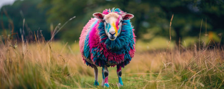 A majestic sheep with colorful wool in vibrant shades of pink, blue, and yellow, standing in a lush green meadow. The bright wool contrasts beautifully with the natural surroundings, creating a striking and whimsical image.