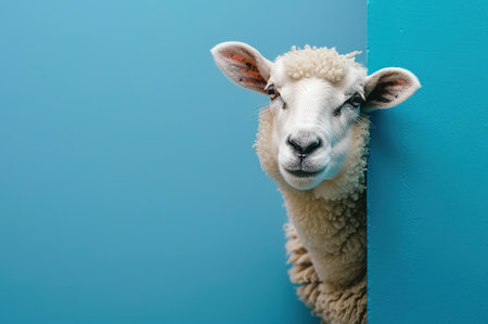Cute sheep peeks out from behind a corner on a blue background. Farm animals.